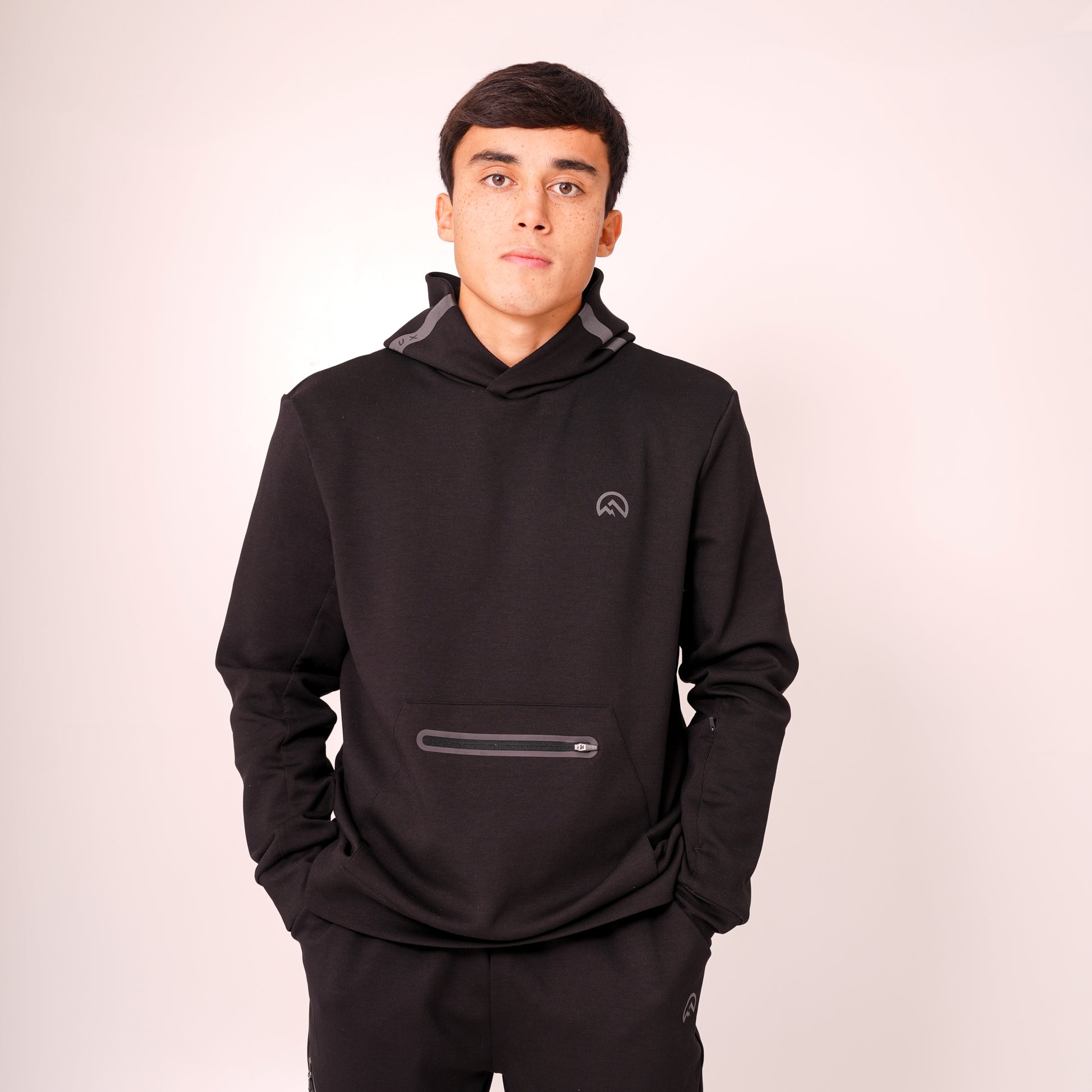 - logo detailing on hood and back